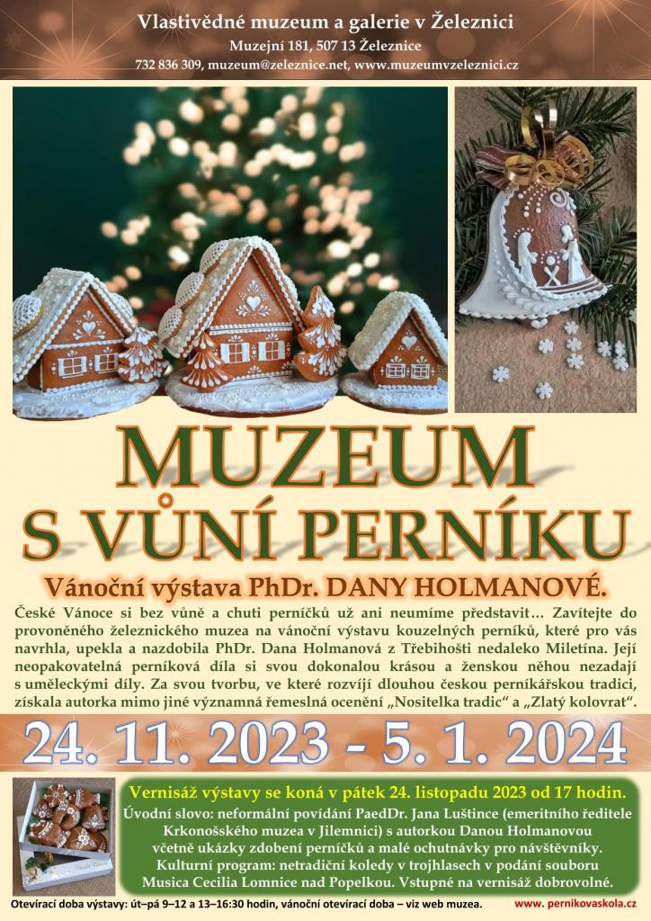 Vánoční výstava děl z voňavého perníku PhDr. Dany Holmanové. Vernisáž výstavy se koná 24. 11. v 17 hodin. Úvodní slovo: PaedDr. Jan Luštinec. Hudební program: koledy v podání souboru Musica Cecilia Lomnice nad Popelkou.