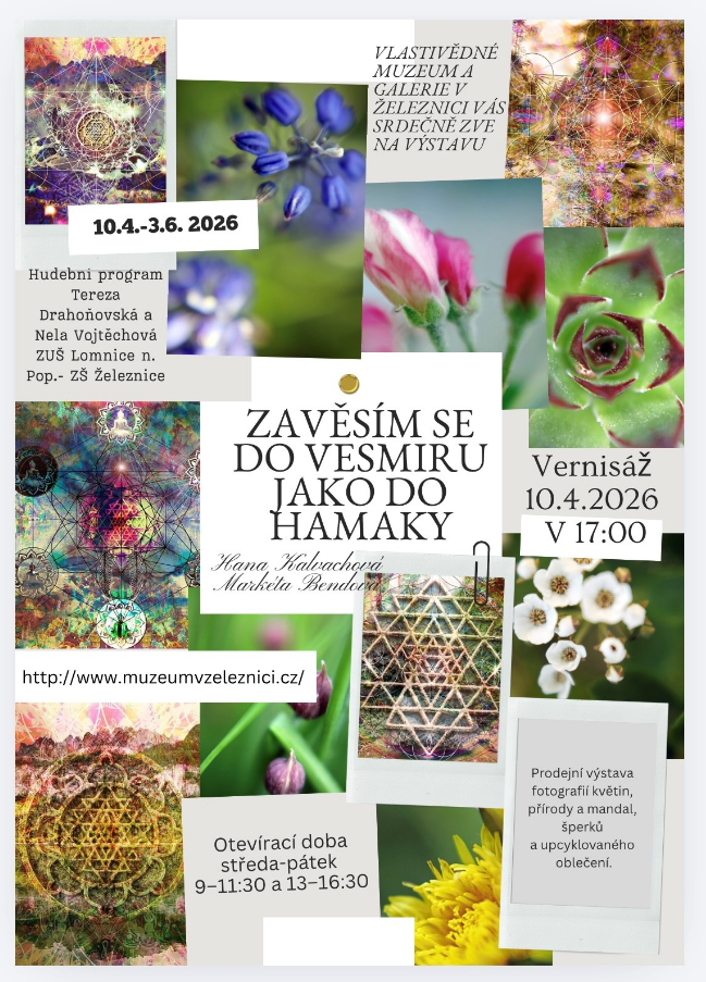 Srdečně vás zveme na výstavu fotografií květin, přírody a mandal autorek Hany Kalvachové a Markéty Bendové. Součástí výstavy bude také prezentace jejich originálních šperků a upcyklovaného oblečení.
